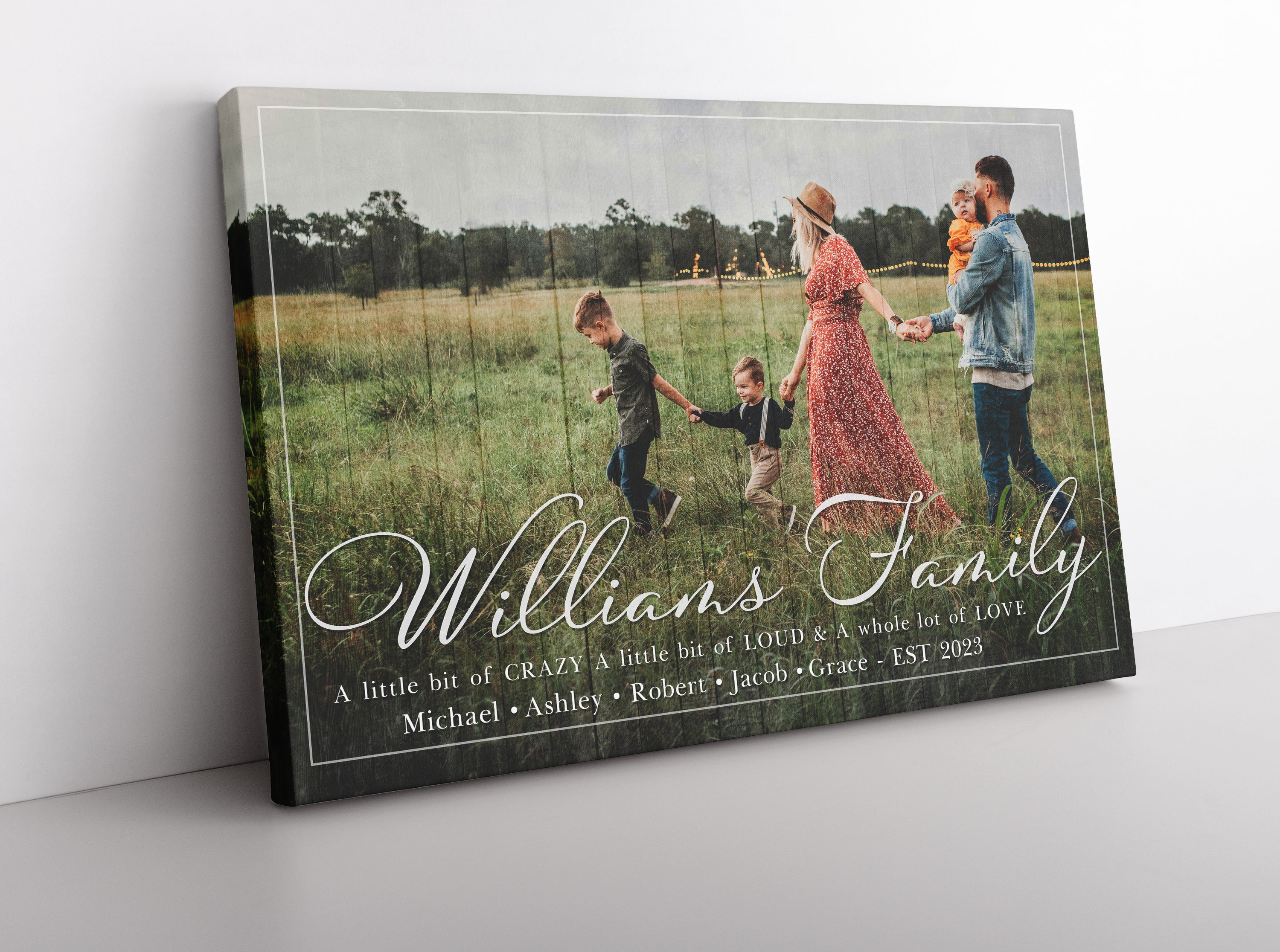 Create a warm, meaningful statement piece for your home with this custom last name sign featuring your family photo, names, and the heartfelt quote: