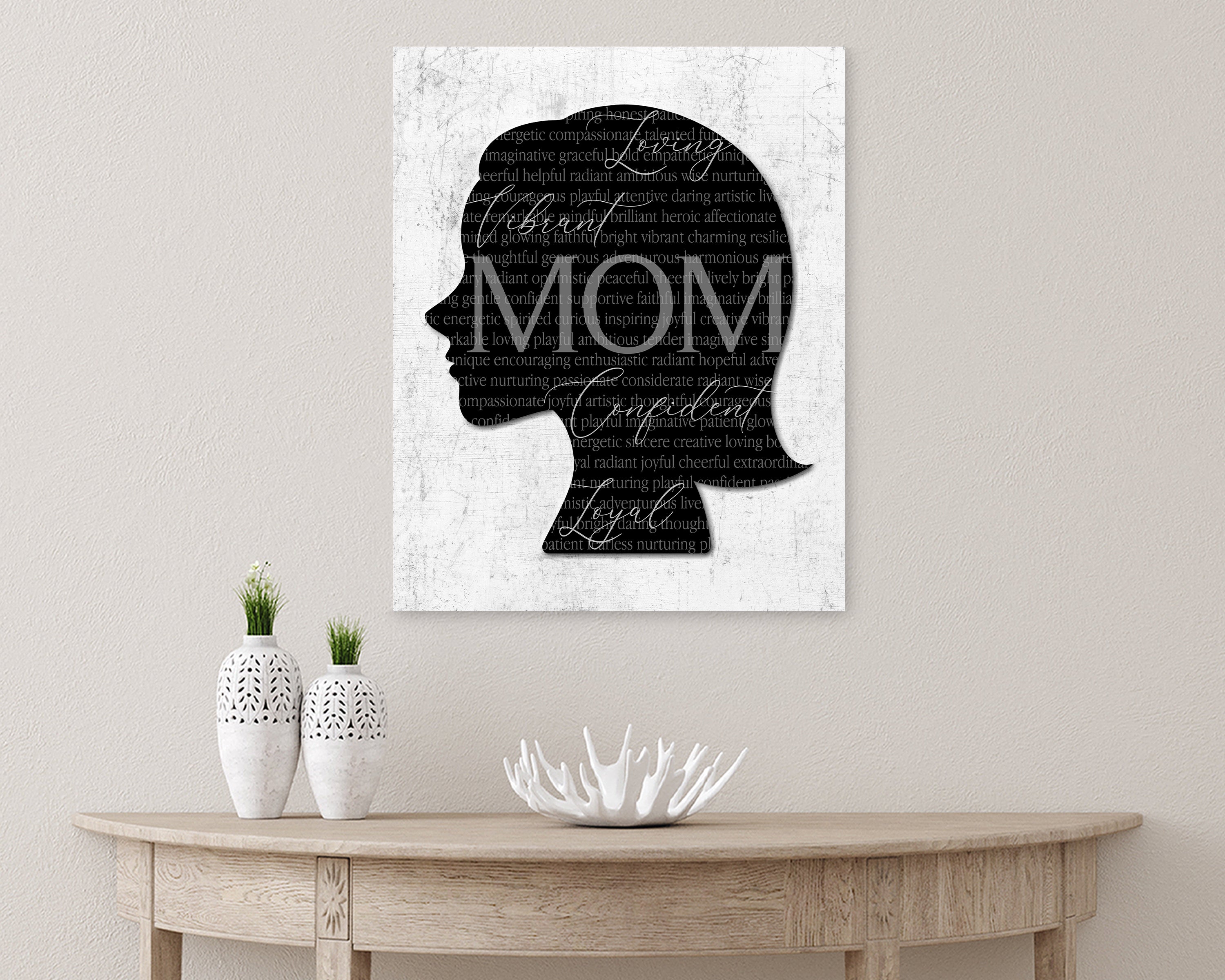 This silhouette is filled with descriptive text that tells their story - the little qualities, the quiet strengths, the love that shows up in everyday moments. Larger highlight words speak the message you want them to feel every time they see it.